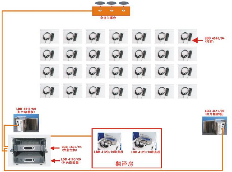 一套完整的同傳設(shè)備包括同傳主機、紅外發(fā)射主機、紅外發(fā)熱板、翻譯器、翻譯間、同傳耳機(代表接收單元)等組成。翻譯器和翻譯間的個數(shù)將根據(jù)會議語言數(shù)來定。同傳耳機(代表接收單元)根據(jù)參會人數(shù)來定。